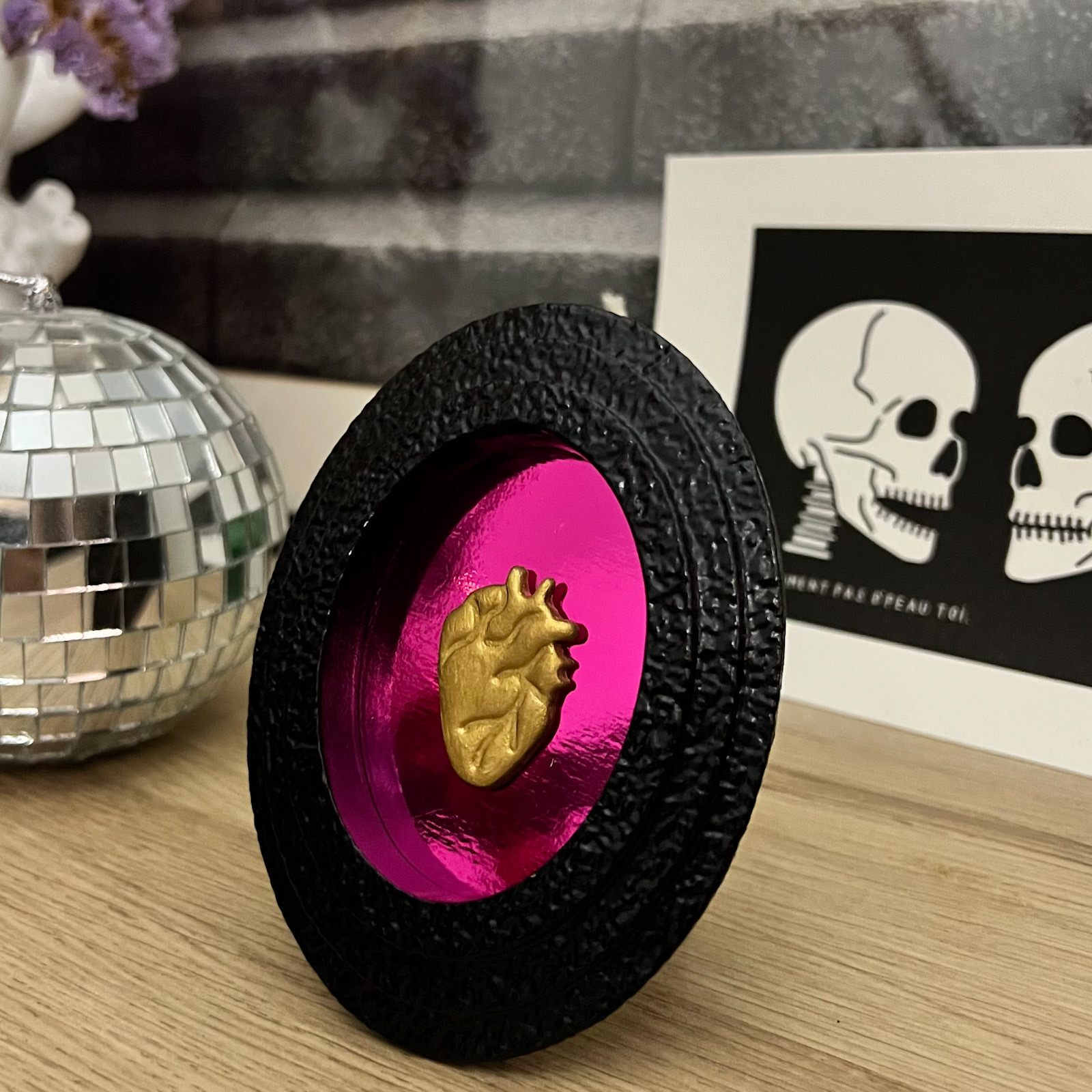 Réalisé en petite série dans mon atelier, ce coeur anatomique doré sur fond violet holographique apportera une touche d’originalité à votre décoration intérieure.